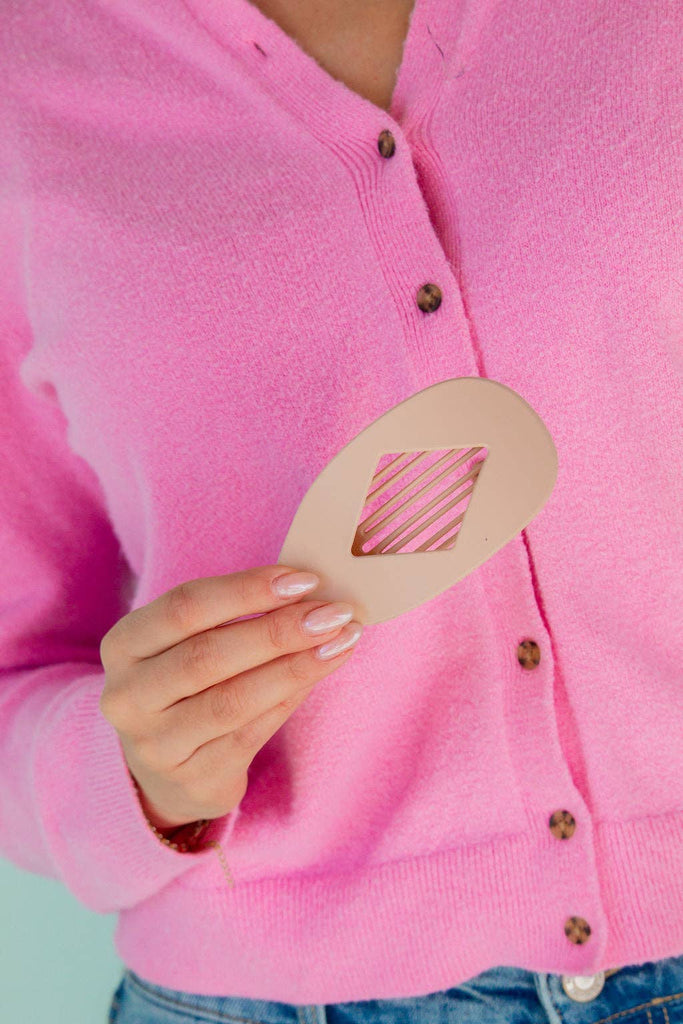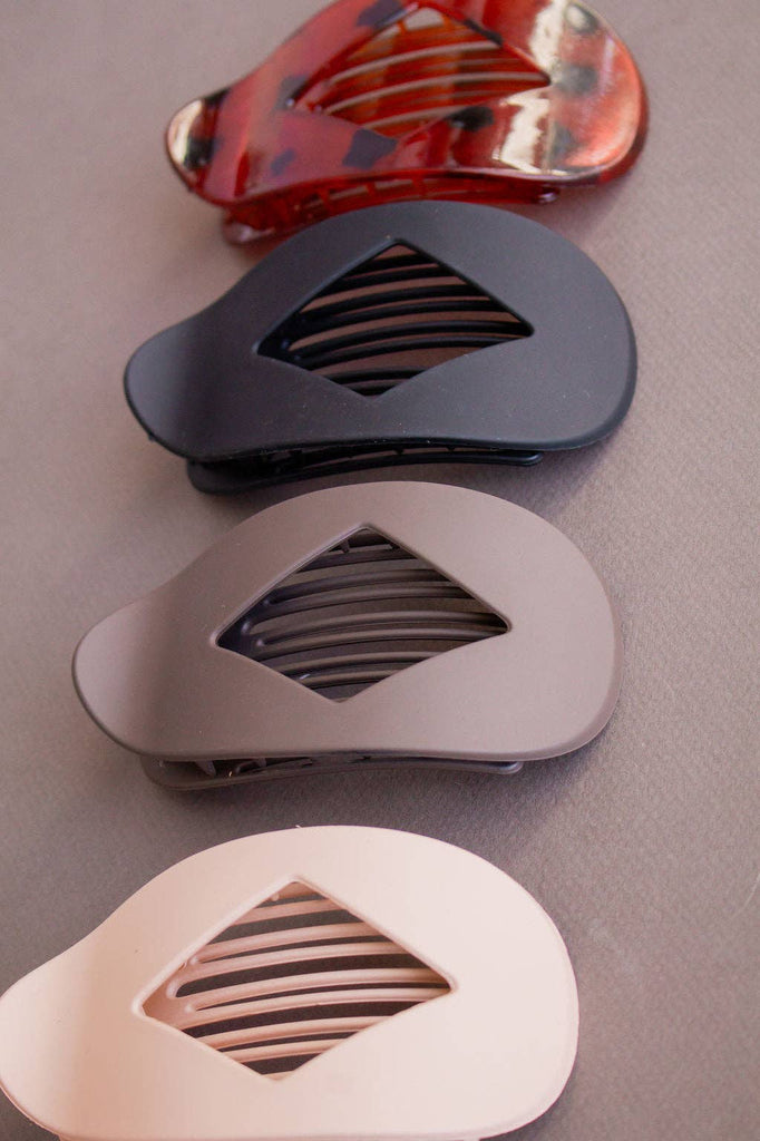 This is a large size flat claw clip measuring at 4 inches, and is absolutely adorable. It comes in the best neutral colors and has an oval shape with a cute diamond cutout shape in the middle. I love these clips for pilates, driving, or the gym!!