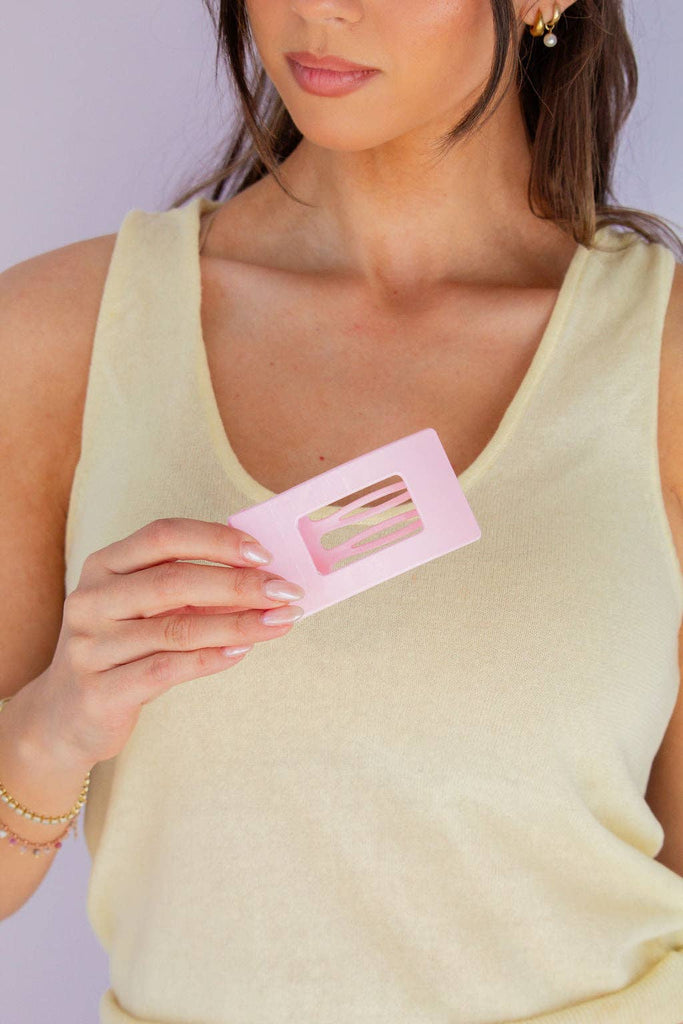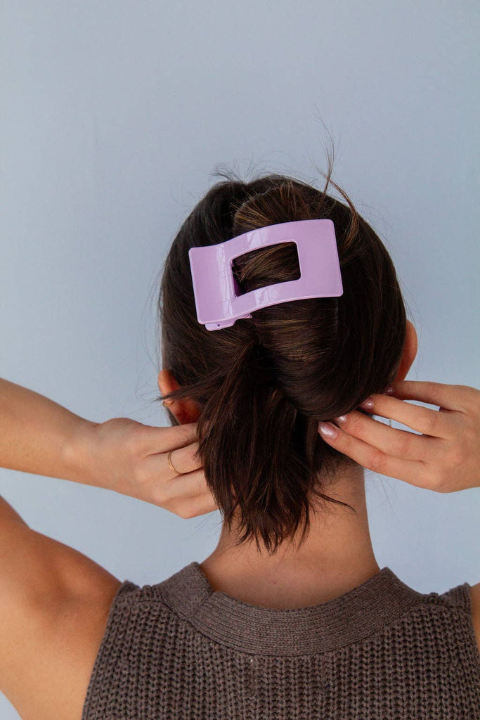 This is a medium size flat claw clip measuring at 3.5 inches, and is absolutely adorable. It comes in the prettiest spring colors and has a unique rectangle shape that'll securely hold your updo all day long. I love these clips for pilates, driving, or the gym!!