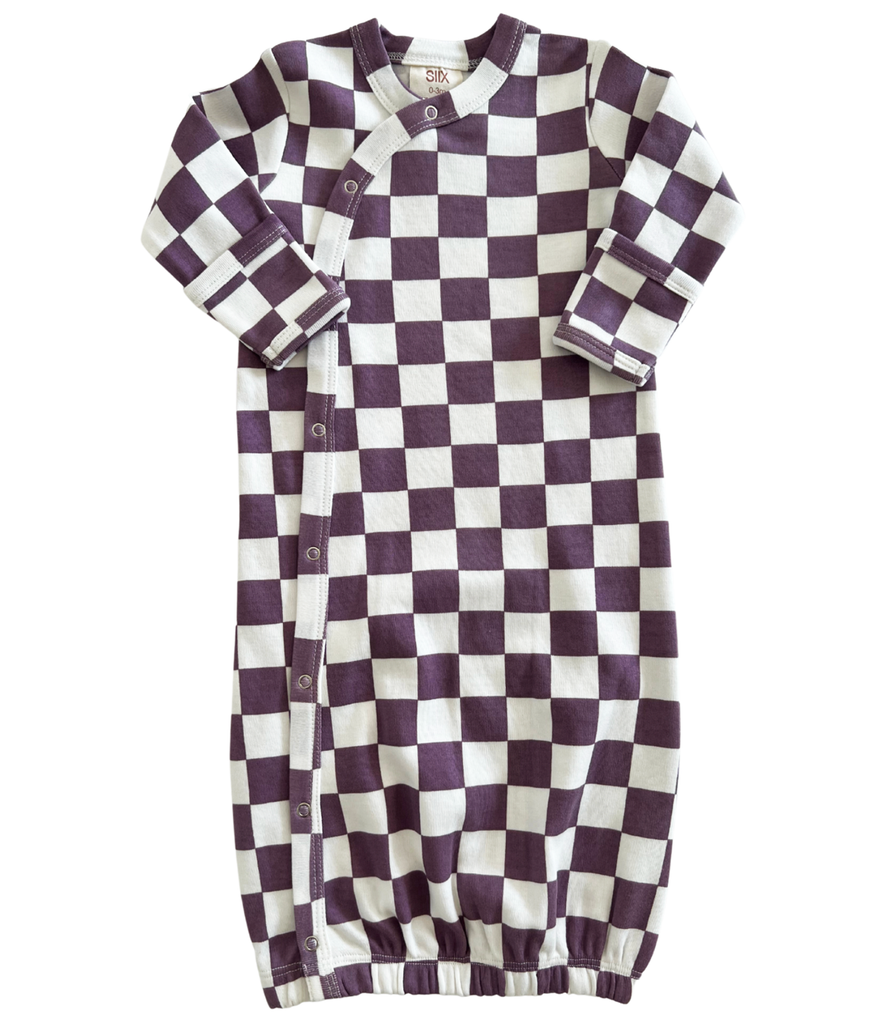 Checkerboard is bold and cheerful: perfect for your little one. On the Organic Gown, now you have ultimate convenience and comfort, too. Newborns can grow with this gown, and parents love how easy diaper changes are.