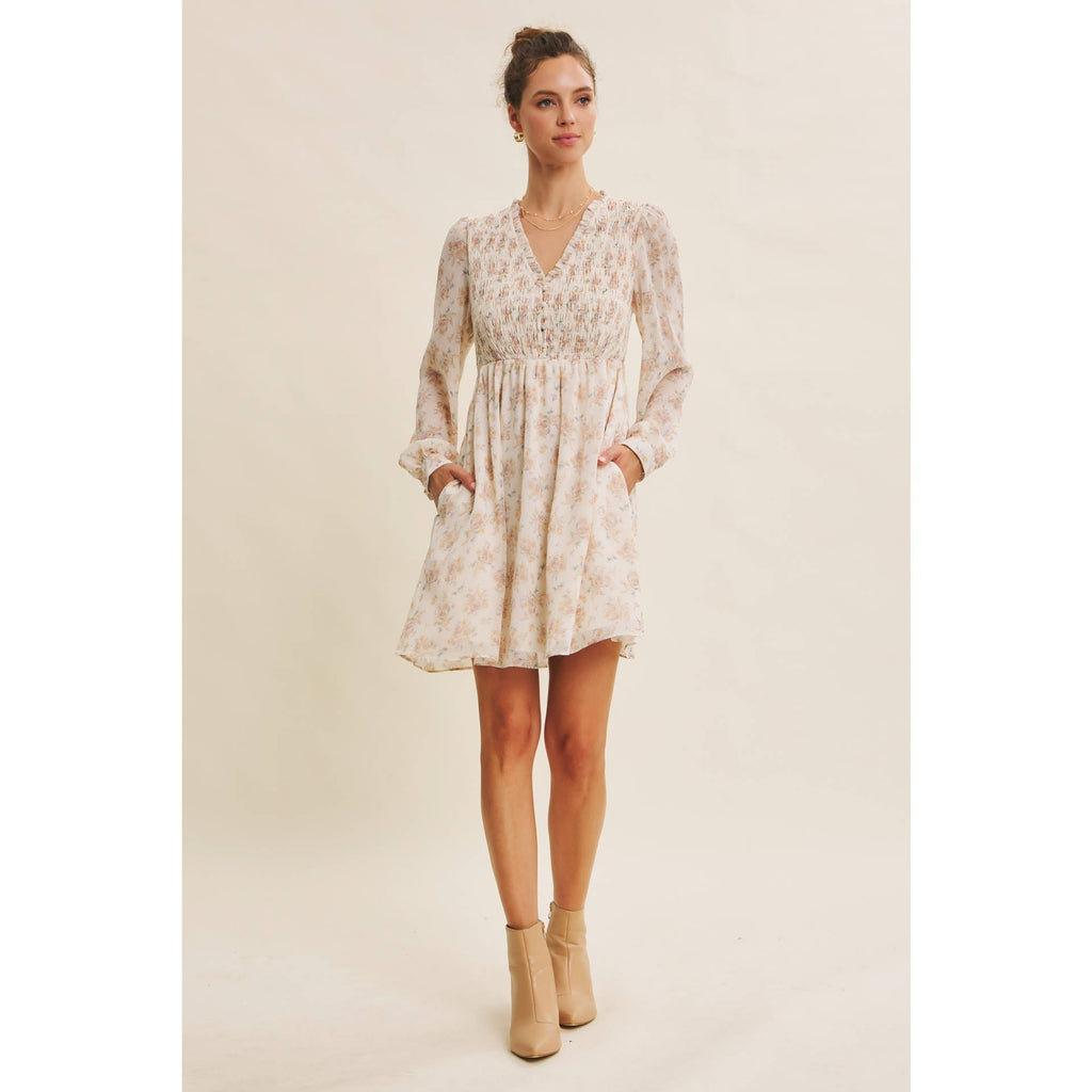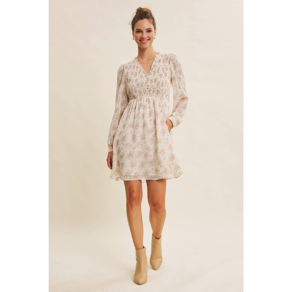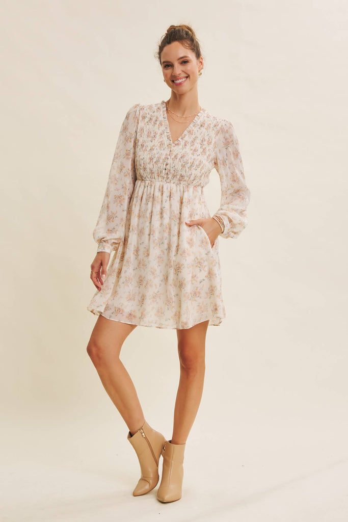 A soft romantic floral for the cooler months. This delicate chiffon mini dress features a smocked bust, balloon sleeves, and softly ruffled v-neckline. The peach and lavender blooms on a creamy ground bring just the right amount of lightness to any FW assortment. From autumn bridal showers to early holiday photos, this babydoll silhouette offers easy charm and comfort. The semi-sheer chiffon overlay floats over a full lining, while button cuffs and side pockets add practicality. Pairs beautifully with boots or Mary Janes for a polished yet relaxed look. A feel-good floral dress that bridges seasons with grace. Features - Ruffled v-neckline - Smocked bust - Babydoll mini dress - Sheer chiffon fabric - Floral print - Button-down - Lined - Button cuffs - Side pockets - Long balloon sleeves Size + Fit Model is 5'9.5" and wearing a size Small Please refer to our size chart