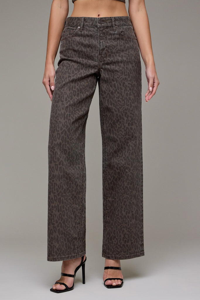 Brown Cheetah Stretch Low Rise Dad Jean featuring a bold animal print design that adds personality to your everyday wardrobe. Crafted from a comfortable cotton-blend fabric with just enough stretch for all-day wear, these low-rise jeans deliver that effortless, relaxed fit. The classic dad jean silhouette pairs perfectly with everything from crop tops to oversized tees. With a 10½" front rise and 31" inseam, these jeans are designed to sit comfortably on the hips while maintaining that coveted vintage-inspired look. The durable 94% cotton, 5% polyester, and 1% spandex blend ensures lasting quality and flexibility with every wear.