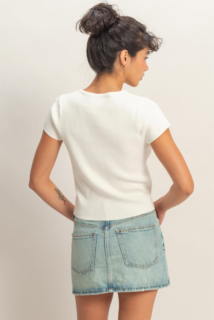 This top is crafted from stretched knit and features a classic round neckline, tailored short sleeves and a full front button placket. Cut in a true-to-size fitted silhouette, this top can be styled with high-waisted jeans and sleek sneakers for a relaxed look.
