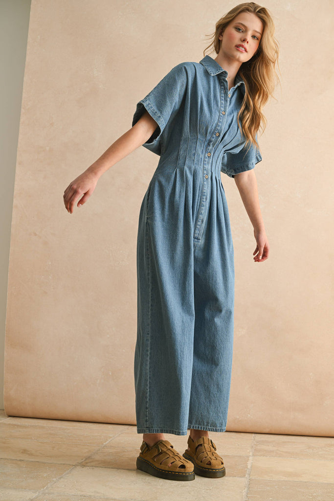 CHAMBRAY DENIM BUTTON DOWN JUMPSUIT: DENIM