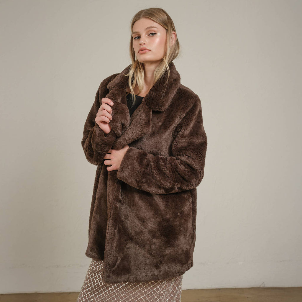 Chocolate Faux Fur Open Front Jacket: CHOCOLATE