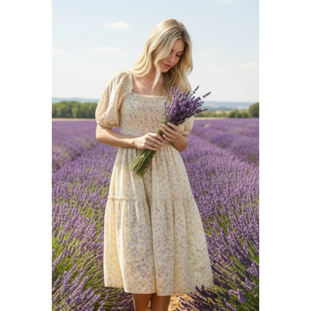 This midi dress features a charming all-over ditzy print. The bodice is adorned with smocking detail, creating a flattering and comfortable fit. The sleeves are short and slightly puffed, adding a touch of volume. tiered silhouette, reaching mid-calf length. Ensuring a balance of comfort and durability, while the lining is 100% rayon for a smooth feel. SELF 50% COTTON 50% POLYESTER LINING 100% RAYON (Model is wearing size S for reference)