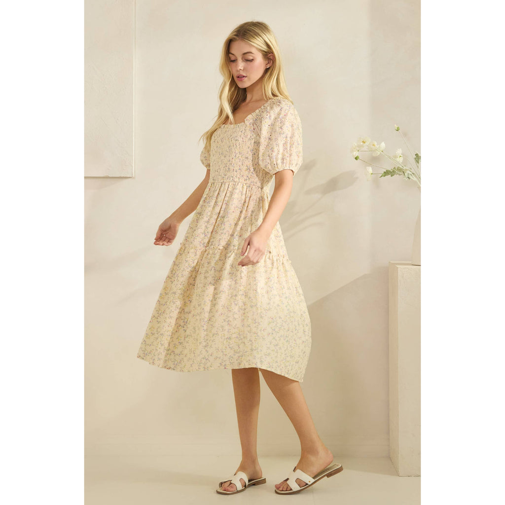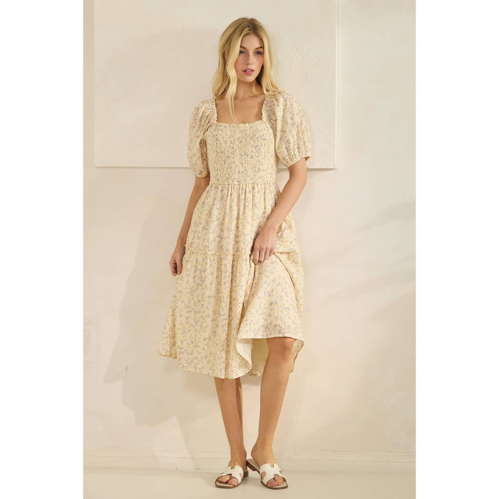 DITZY PRINT HALF SLEEVE SMOCKING DETAIL MIDI DRESS: YELLOW COMBO