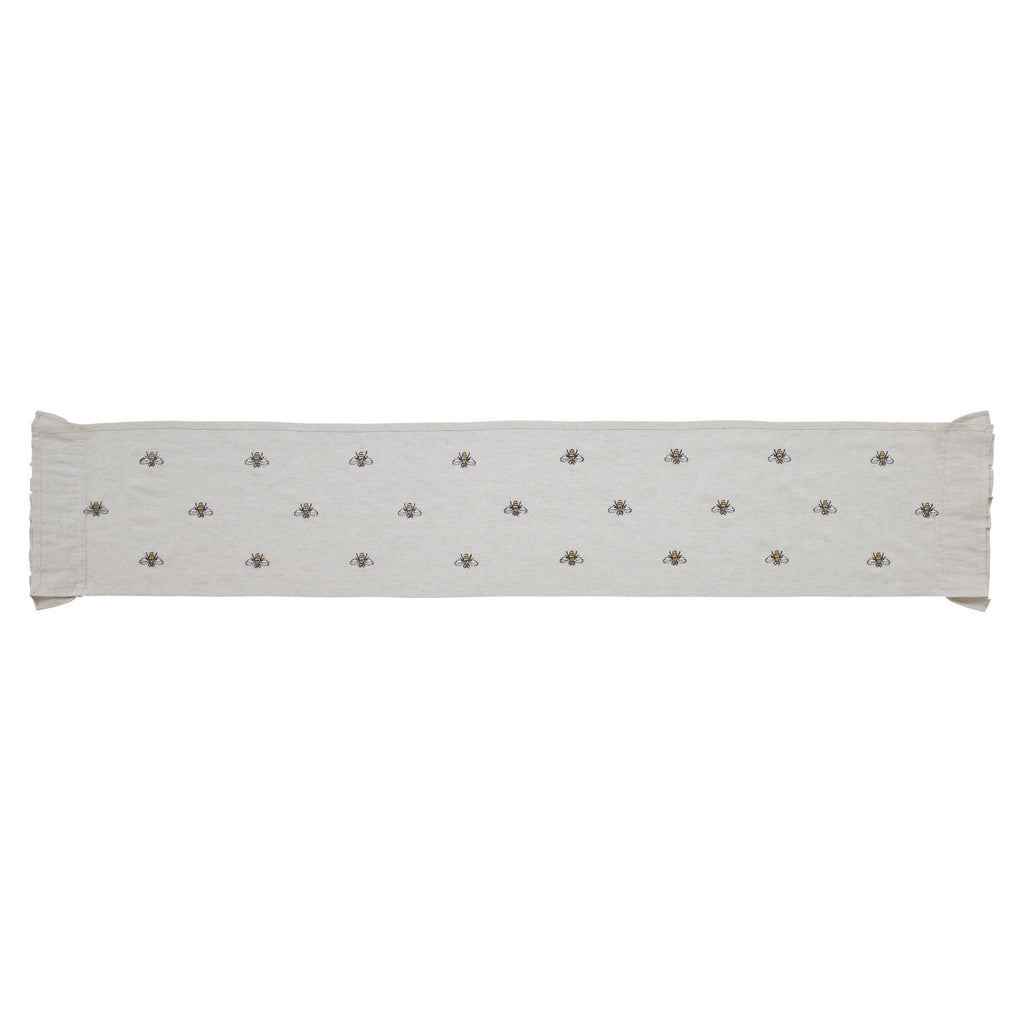 Create a joyful table for friends and family to gather round with a charming cottage-friendly design. The Embroidered Bee Runner includes one table runner measuring 13x72 inches. The rich texture and ruffled edging of the cotton-linen blend fabric is given a timeless feel with a natural creme color for soft, modern country vibes. Whimsical bees are embroidered across each runner for a cheerful look that will have guests buzzing. Complete your tabletop decor with other pieces from the Embroidered Bee Collection by VHC for modern farmhouse style.