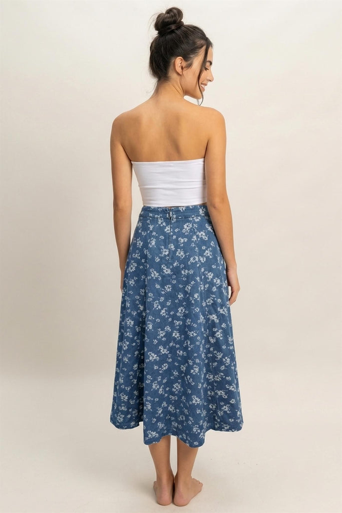 This A-line midi skirt features a charming floral pattern and a secure back zipper closure. The garment wash adds a touch of texture and softness. Its flowy silhouette offers elegant movement, making it perfect for pairing with a fitted blouse and ankle boots for a chic ensemble.