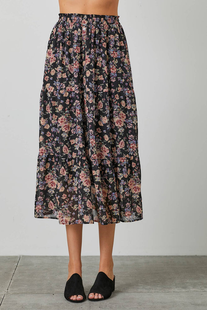 FLORAL PRINT BUTTON FRONT SKIRT: BLACK MULTI