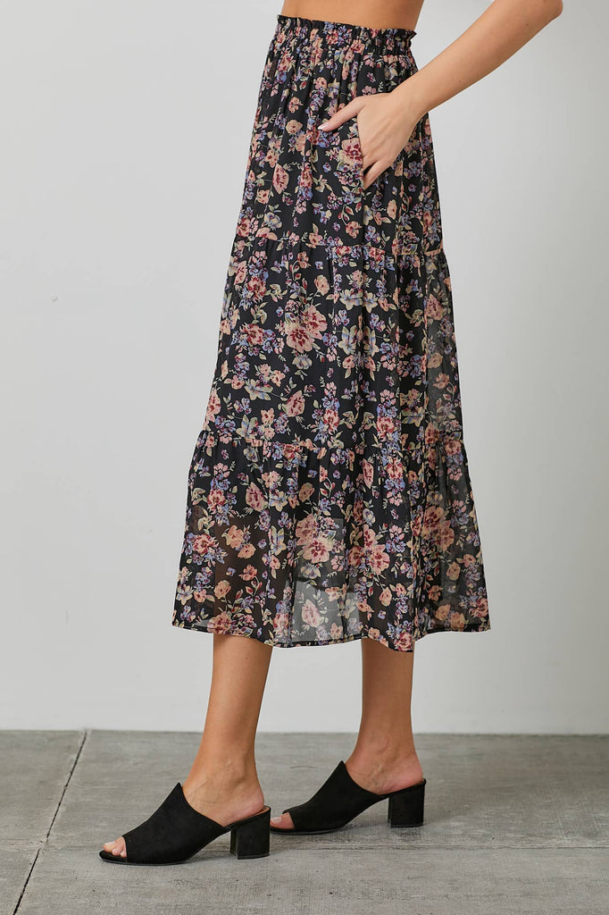 Twirl into spring with this charming midi skirt that's bursting with personality! Featuring a vibrant floral print in black multi tones, this piece brings effortless style to any wardrobe. The convenient button-front closure adds a touch of vintage-inspired flair, while hidden pockets keep your essentials close. Perfect for brunch dates, casual outings, or whenever you want to add a pop of botanical beauty to your look. Pair it with your favorite tee or blouse for an instantly put-together vibe that feels anything but basic.