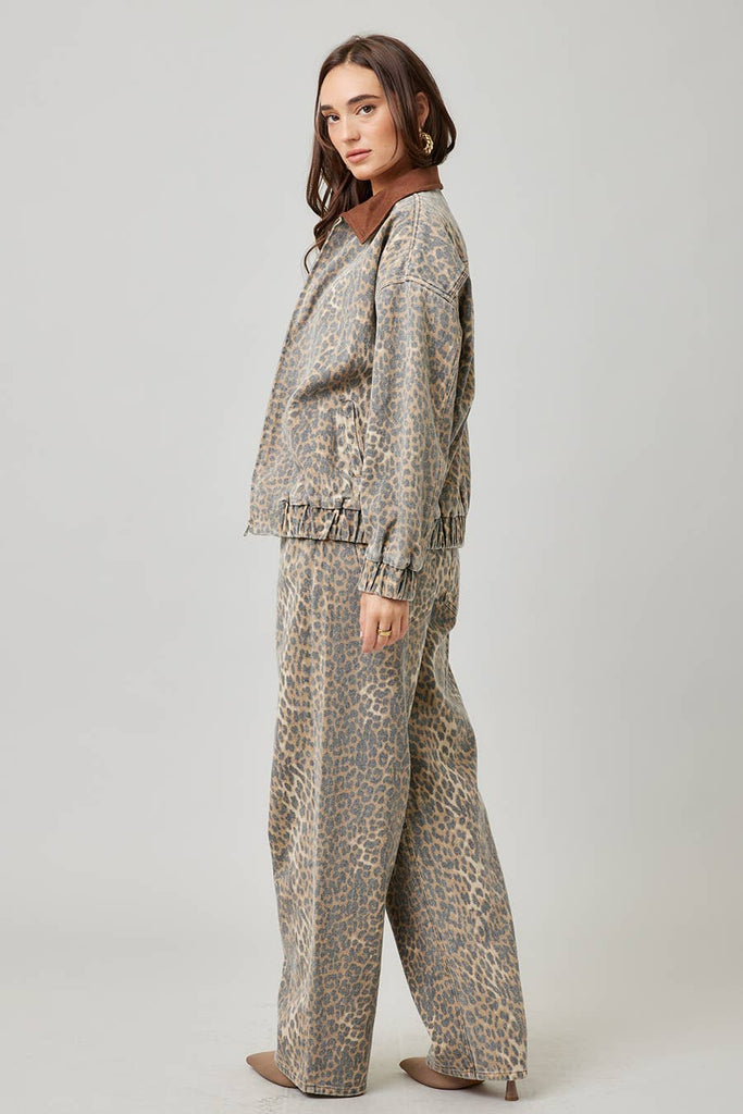 Embrace your wild side with this Garment Washed Leopard Jacket, featuring a bold leopard print that adds instant flair to any outfit. Its relaxed fit and dropped shoulder design ensure effortless comfort and cool vibes all day long. The contrast suede collar adds a touch of unexpected texture and sophistication, making this jacket a statement piece you'll love to wear. Perfect for layering over your favorite casual looks, it’s the playful, stylish jacket that brings out your inner fashionista with a confident roar.