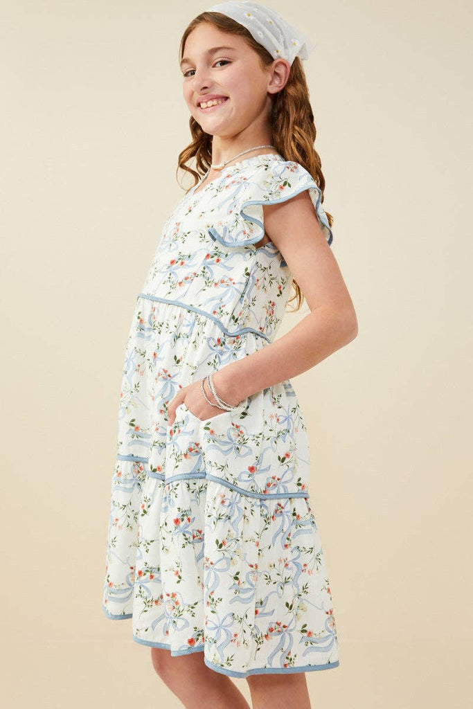 Girls Floral Ribbon Print Contrast Trim Dress: Blue