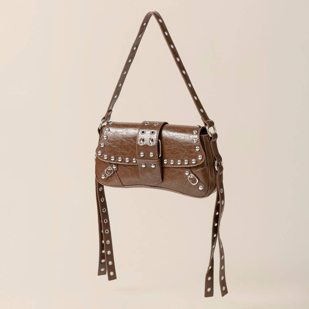 Stay on-trend and ahead of the fashion curve, this shoulder bag features a distinct glossy faux leather rivet trim design. A chic and sophisticated shoulder bag that's perfect for dressing up or down. Available in BK, BR, IV, S, BU and LE. This item is sold in packs of 1.