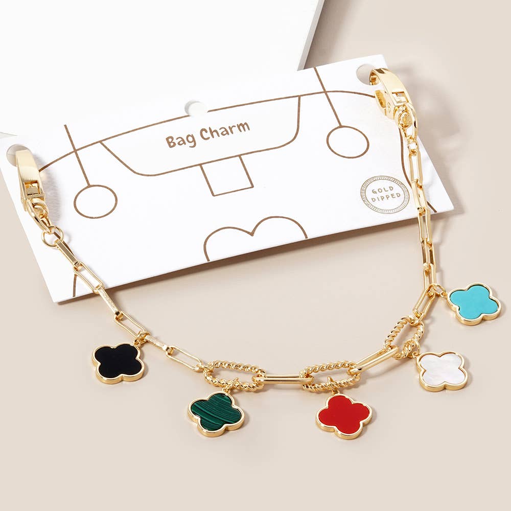 Gold Dipped Quatrefoil Charm Station Paperclip Chain Bag Charm: Black,Gold,White