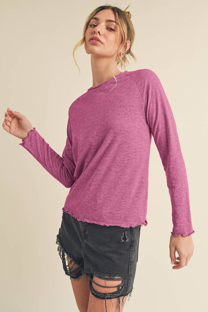Whether layered or worn solo, this timeless Gwen baby long sleeve tee captivates with its staple long-sleeve silhouette, slub fabric, and charming lettuce-style hemlines. Effortless style that lasts.