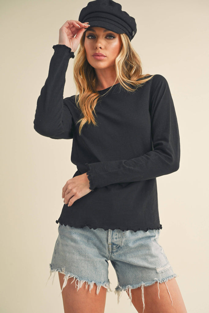 Whether layered or worn solo, this timeless Gwen baby long sleeve tee captivates with its staple long-sleeve silhouette, slub fabric, and charming lettuce-style hemlines. Effortless style that lasts.