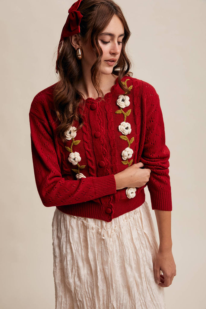 This charming red cardigan brings handcrafted elegance to your everyday wardrobe. Featuring delicate crochet flowers arranged in vertical rows with leafy stems, it's a wearable work of art. The soft, breathable knit fabric showcases an intricate eyelet pattern, while cable knit accents add texture and visual interest. A romantic crew neckline with scalloped edging frames the face beautifully, and matching knit-covered buttons provide a polished finish. Ribbed cuffs and hem ensure a cozy, flattering silhouette that feels as good as it looks.