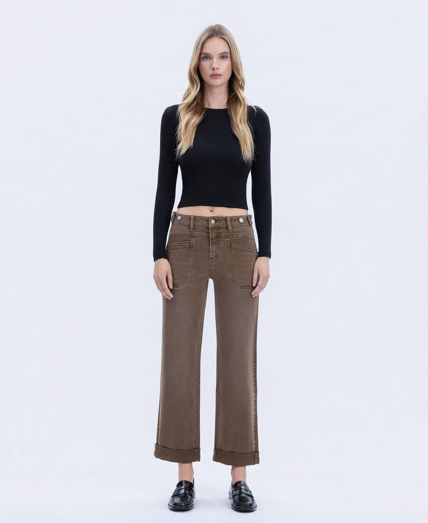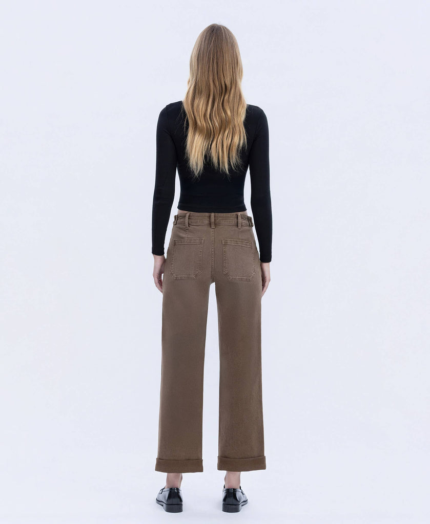 HIGH RISE TABBED WAISTBAND CUFFED SLIM WIDE JEANS: COFFEE