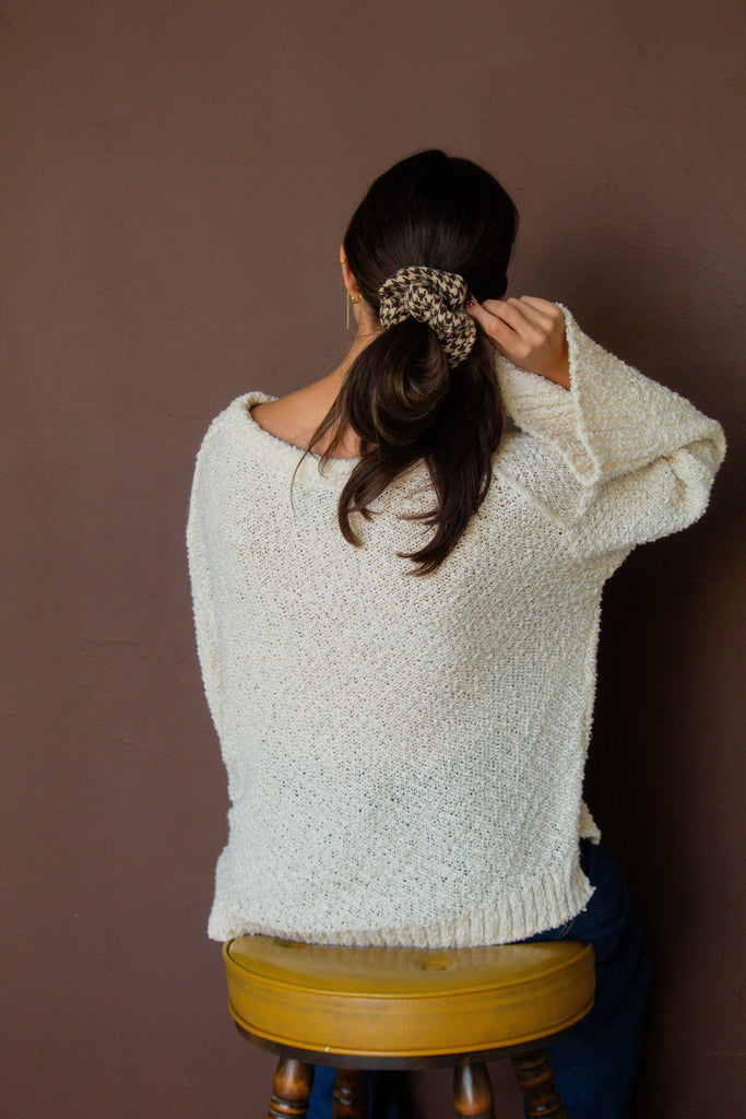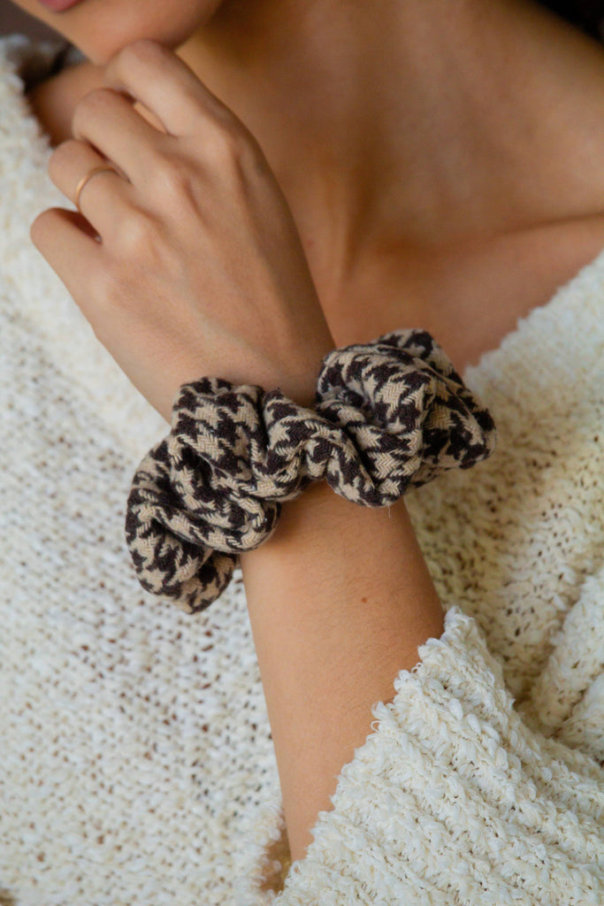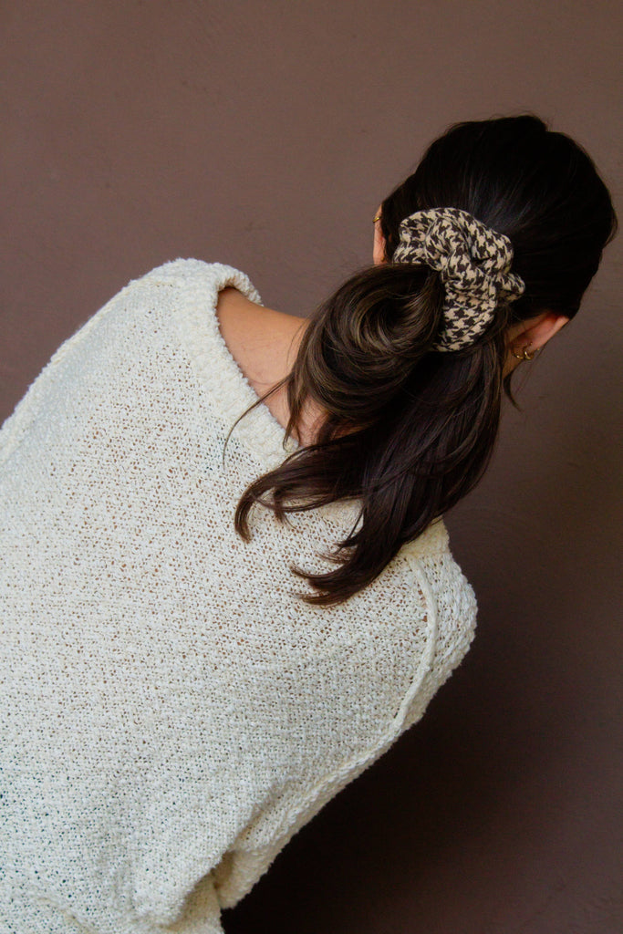 This oversized scrunchie is the perfect addition to your fall accessories. It is made in a thicker sweater style fabric in the perfect houndstooth pattern! Obsessed with the brown on brown tones. It'll be the perfect addition to your hairstyles this fall.