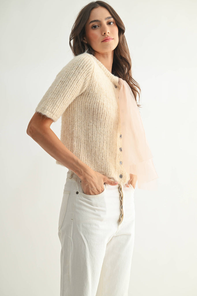 KNIT CARDIGAN WITH CHIFFON BOW - SAND