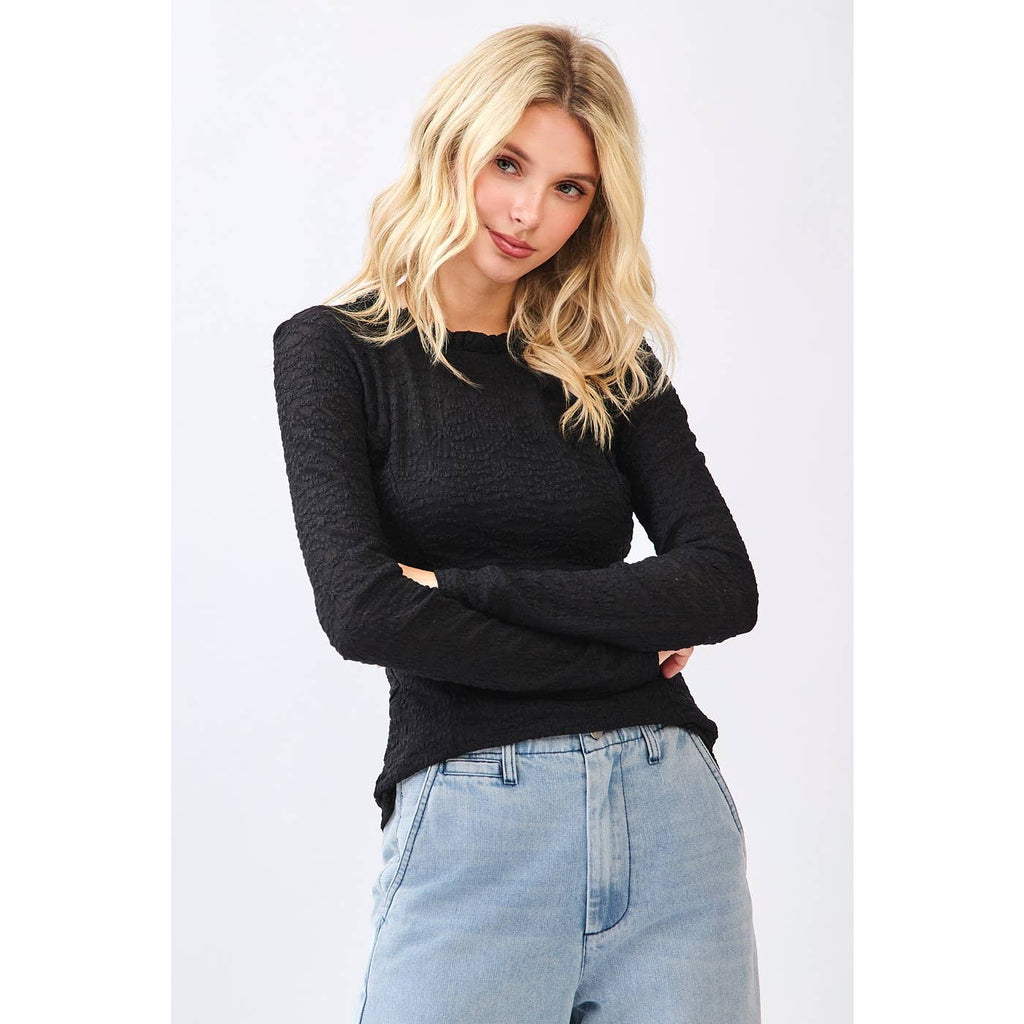This playful layering top is crafted from delicate floral sheer lace knit fabric, adding a touch of romance to any outfit. The round neckline features charming ruffle details that bring whimsy and elegance, while the long sleeves provide graceful coverage. Unique side panel accents create subtle dimension, and the keyhole back with a button closure adds a flirty finish. Perfect for layering or wearing on its own, this top effortlessly blends feminine details with comfortable style in classic black.