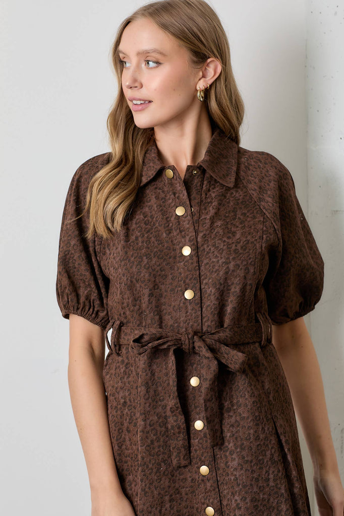 Make a bold statement with this playful leopard print midi dress in red brown. Featuring a classic collared neckline and a button-down front, it adds effortless chic to your look. The adjustable waist tie lets you create a flattering silhouette, while the elastic sleeve cuffs bring a touch of ease and comfort. Perfect for day-to-night adventures, this dress combines wild charm with wearable style.