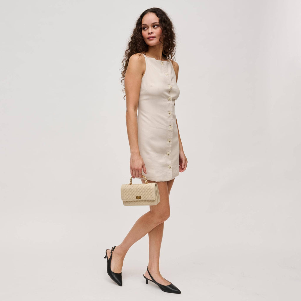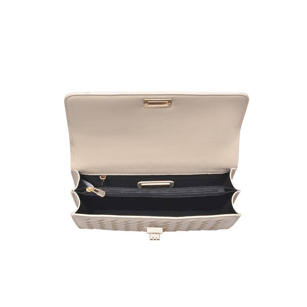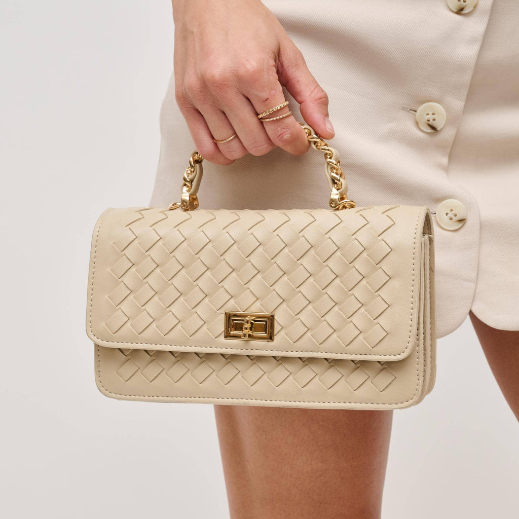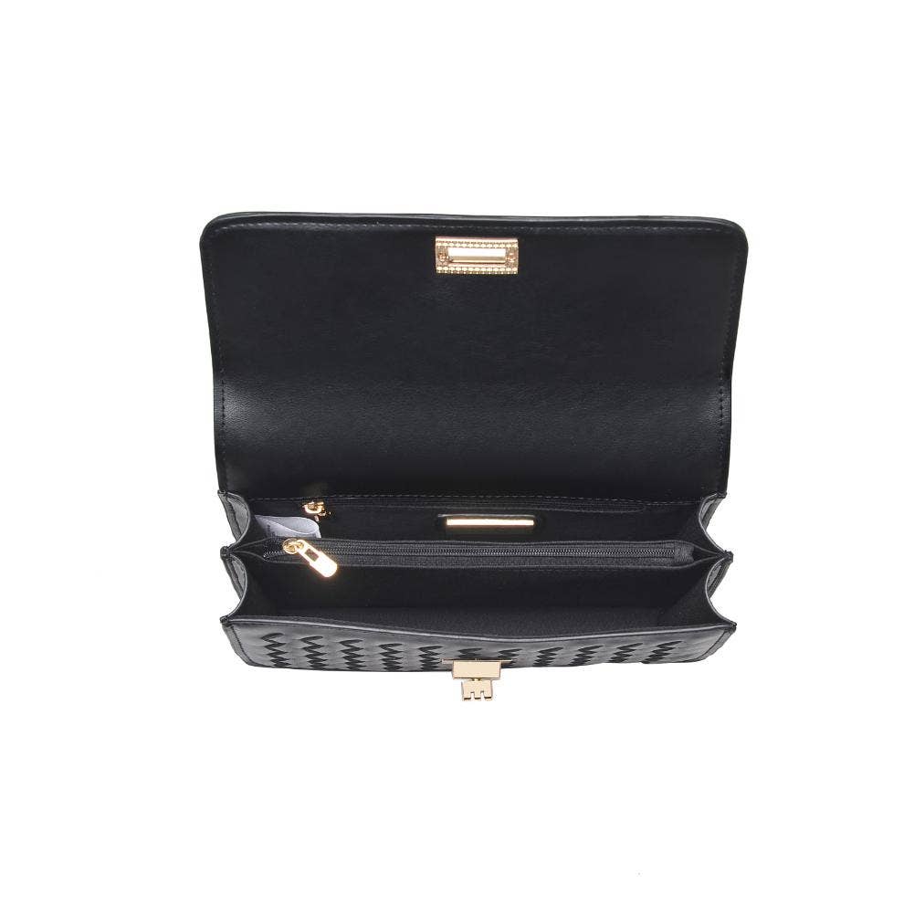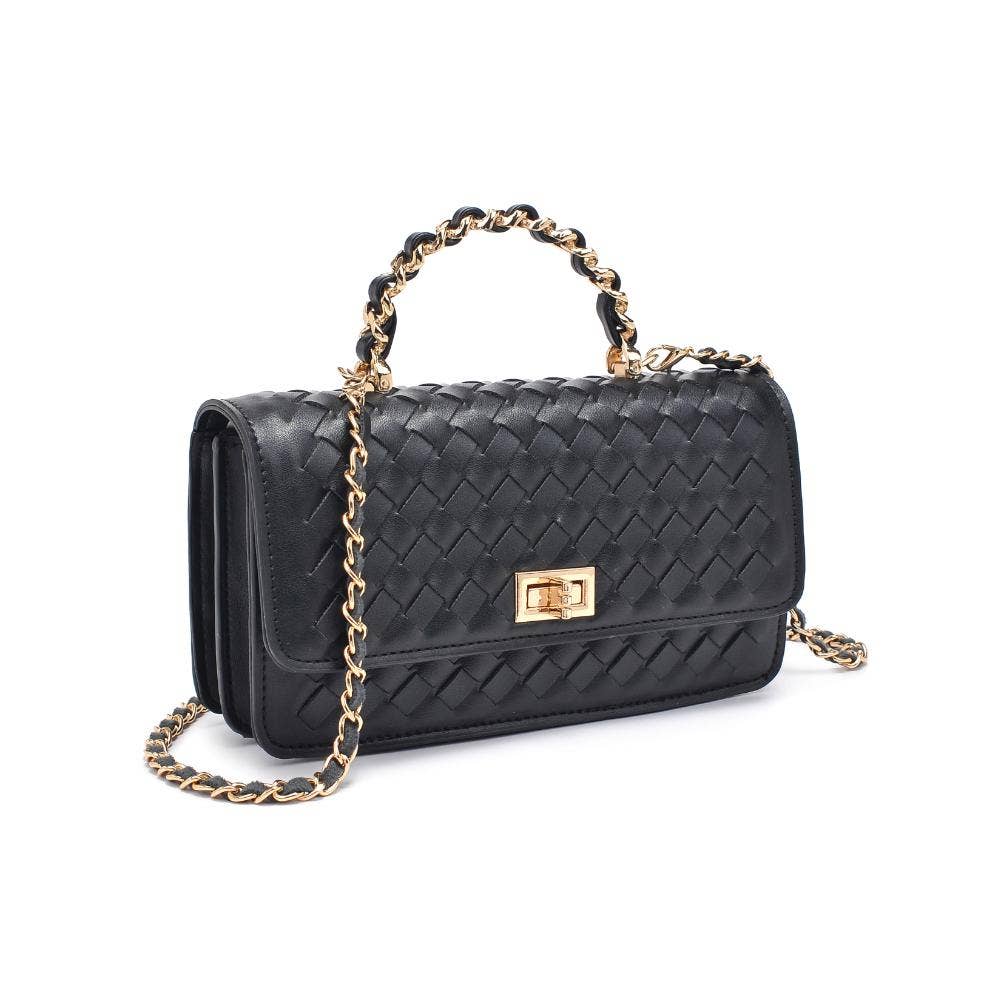 *Exterior Details: Woven Vegan Leather, Chain Top Handle, Detachable Chain Strap