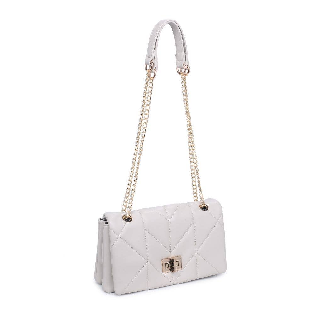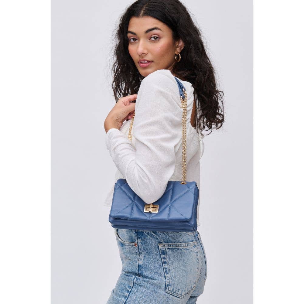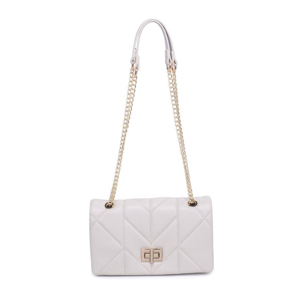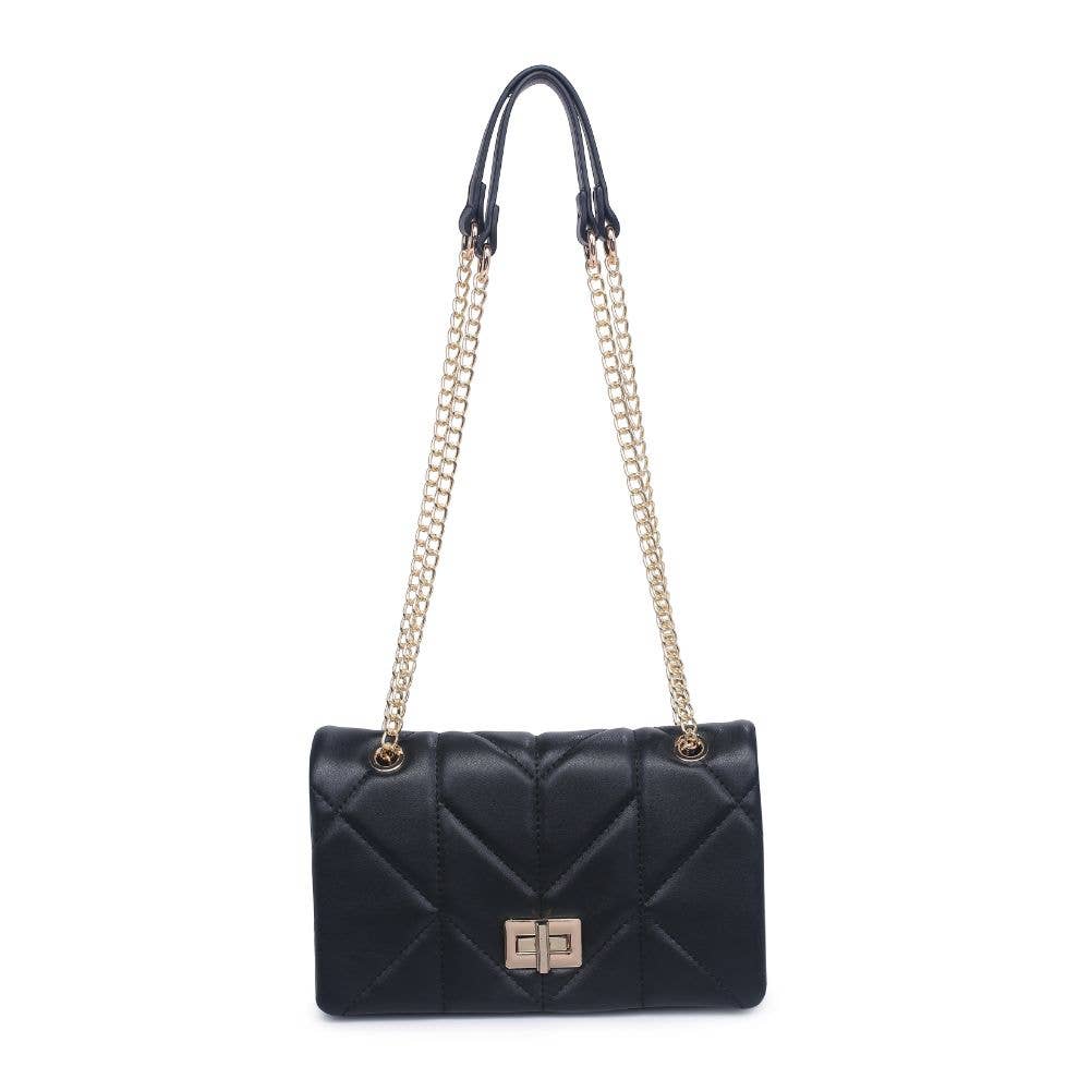 The intricate and eye-catching quilted design, combined with the elegant gold hardware, creates a unique and fashion-forward look. With an adjustable strap for comfort and a secure turn lock closure to keep your essentials organized and safe, this crossbody is the perfect accessory for any occasion that calls for a touch of edge.