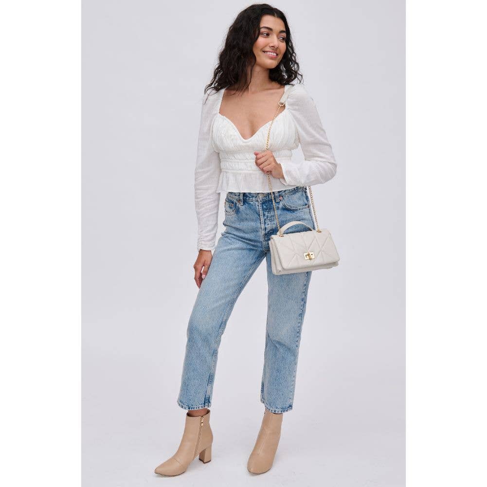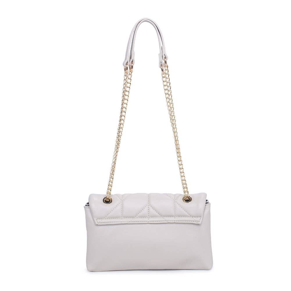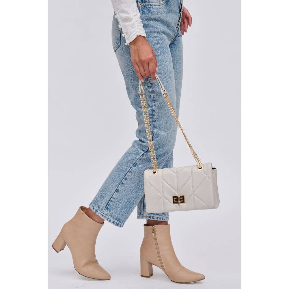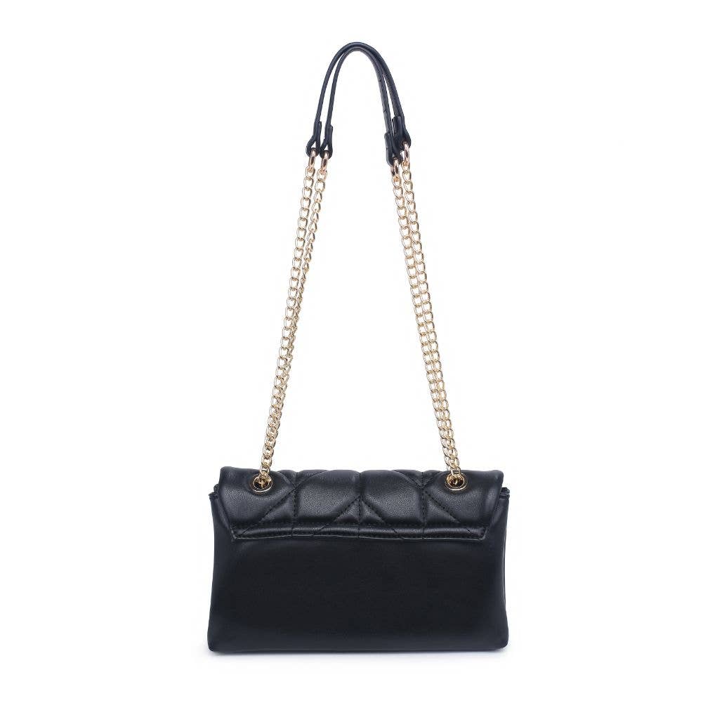The intricate and eye-catching quilted design, combined with the elegant gold hardware, creates a unique and fashion-forward look. With an adjustable strap for comfort and a secure turn lock closure to keep your essentials organized and safe, this crossbody is the perfect accessory for any occasion that calls for a touch of edge.