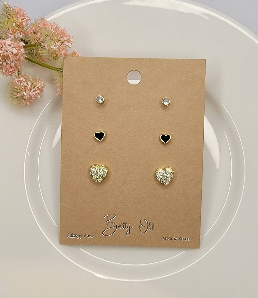 MINI CZ HEART DESIGN 3 PAIR SET POST EARRINGS.