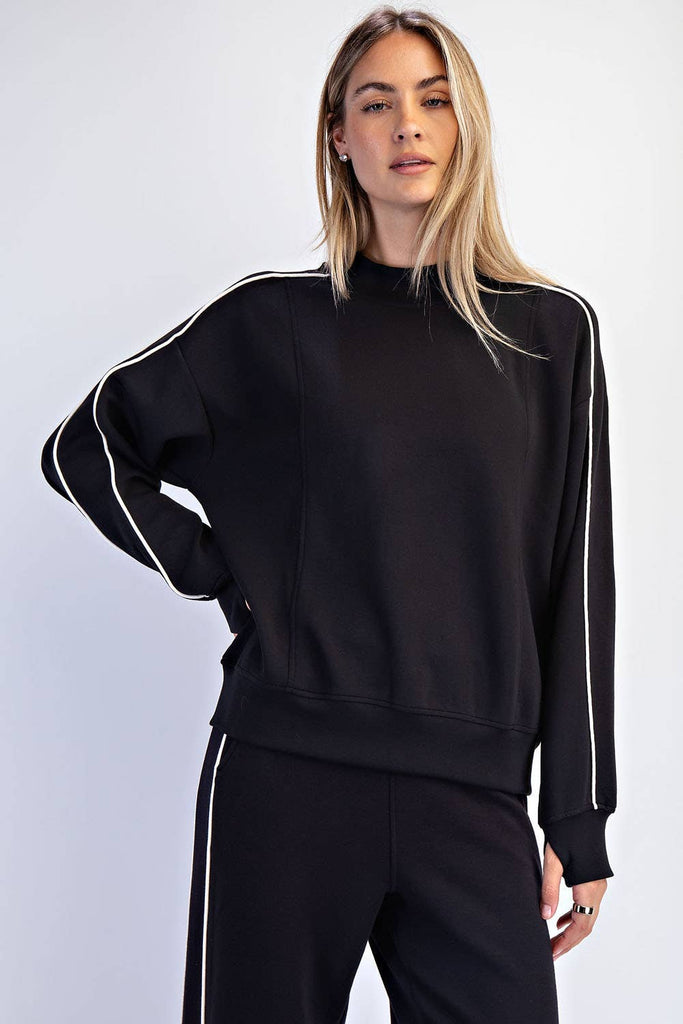 Crafted from luxurious, silky-soft Modal Scuba fabric. Featuring sleek piping details and a luxurious feel, it's the perfect blend of comfort and polish for daily wear. Features: - Modal poly span scuba fabric - Silky smooth and lightweight - 4-way stretch - Relaxed fit - Long sleeve top - Mock neck - Dropped shoulder - Double-stripe piping details - Thumbhole details Model is 5'8" and wearing size Small. Fabric: 48% Modal, 45% Polyester, 7% Spandex C.O.O: Import