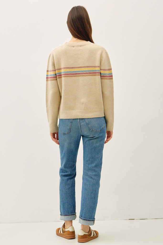 Stay cozy and stylish this season with our multiple color striped sweater in warm taupe. This ultra-soft pullover features a classic crew neck and long sleeves, perfect for layering or wearing on its own during crisp fall and winter days. The playful striped detailing on both the body and sleeves adds a fun, vibrant touch to your wardrobe basics. Whether you're heading out for a casual day or curling up with a good book, this sweater promises comfort and charm in every stitch. Get ready to fall in love with your new favorite knit!