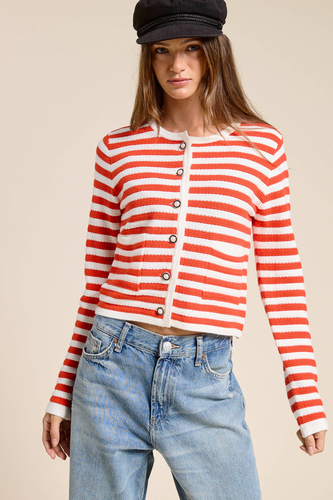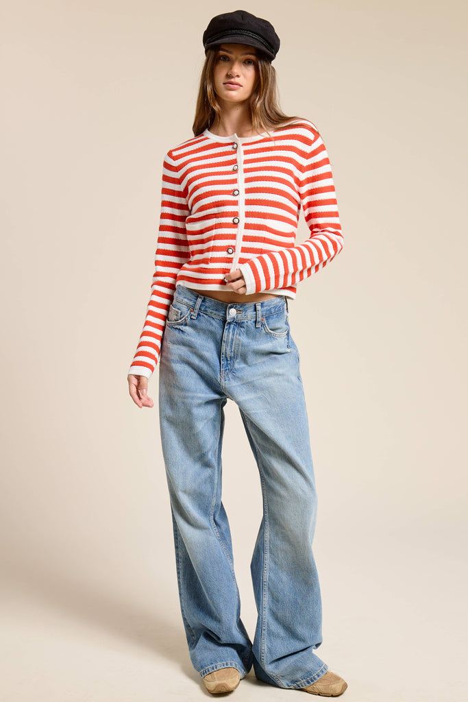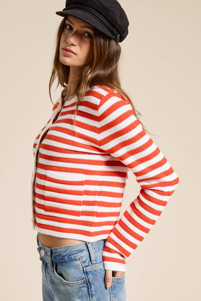 Pearl Embellishment Striped Cardigan Sweater: Fire