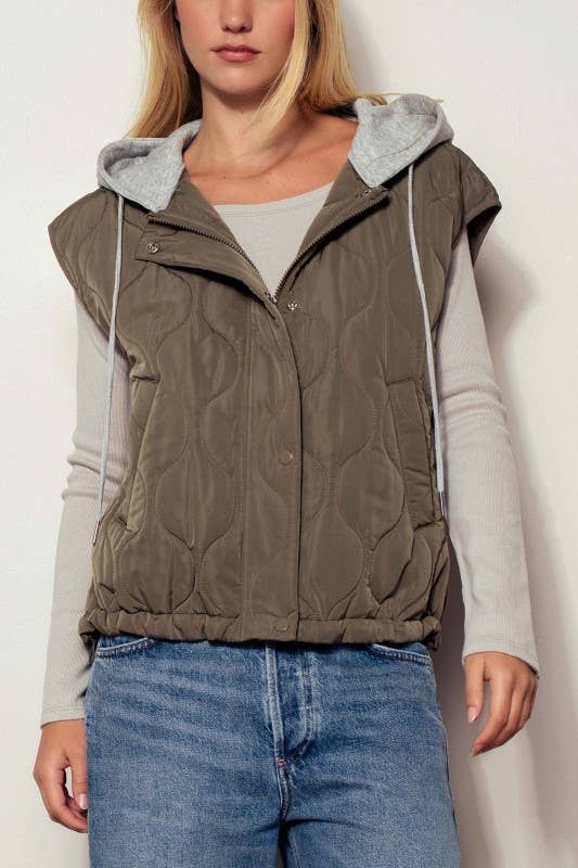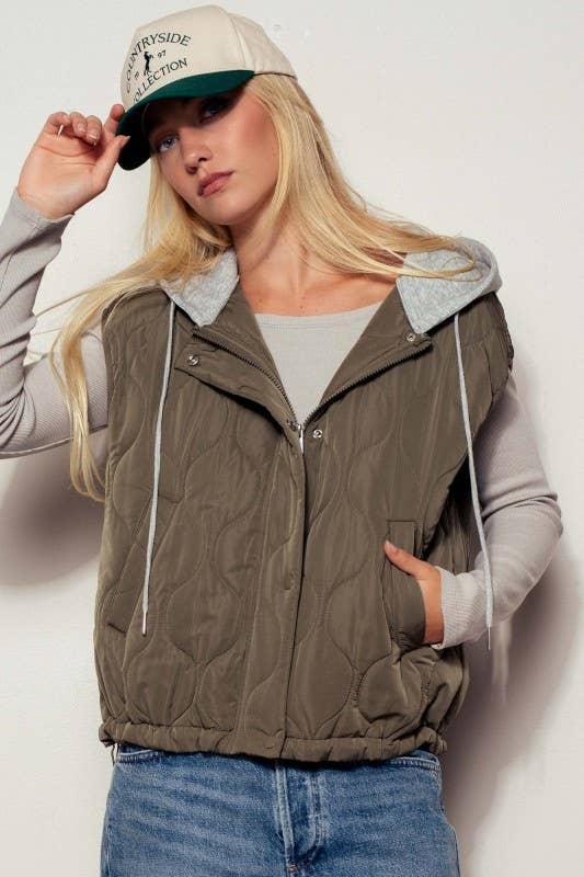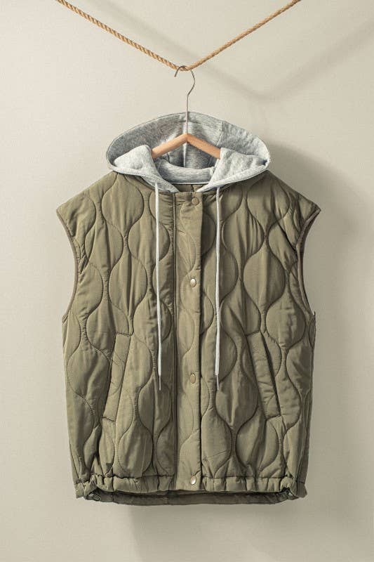 Add a relaxed western touch to your summer 2025 wardrobe with this quilted vest, featuring a cozy attached hoodie and snap-button closure. The lightweight, softly lined design is perfect for layering over tops, jumpsuits, or maxi dresses for effortless style and comfort. Features: • 100% Polyester • Lightweight quilted material • Attached drawstring hoodie • Soft inner lining • Made in China Fit: Relaxed, slightly oversized fit for easy layering