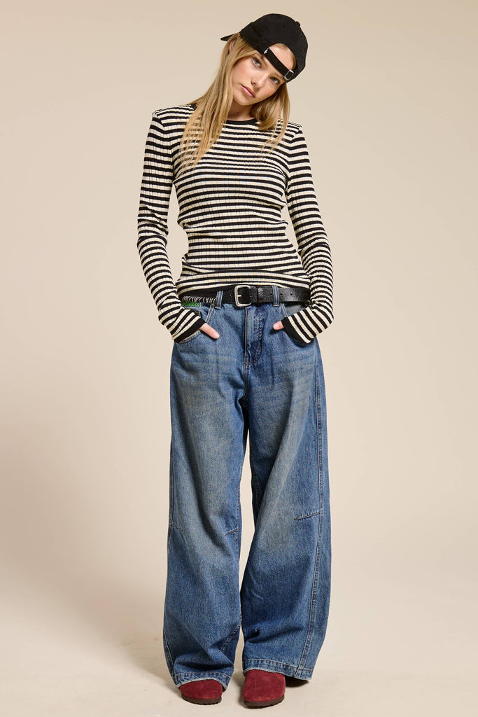 Made from a ribbed knit fabric, this long sleeve top features bold horizontal stripes in warm neutral tones. Designed with a classic crew neckline and a snug fit, it delivers a sleek silhouette that pairs effortlessly with denim, cargos, or your favorite layers. A timeless staple with a minimal, casual vibe for everyday wear. striped long sleeve top, ribbed knit top, neutral striped shirt, fitted striped tee, crew neck knit top, fall layering basics, retro stripe top, stretchy knit long sleeve, everyday knitwear, casual ribbed shirt, minimal style top, soft knit blouse, neutral tones top, transitional fall top, retro-inspired knit top, fall 2025, winter 2025
