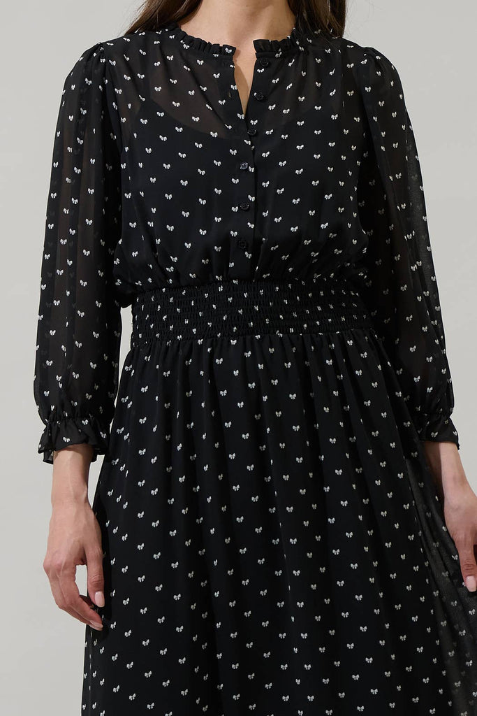 Rosaly Bow Irene Smocked Midi Dress: BLACK-WHITE