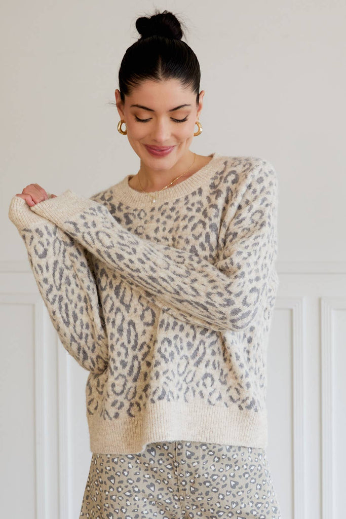 Cozy meets playful in this round neck long sleeve animal print sweater, featuring a charming cream-grey design that adds a touch of wild spirit to your wardrobe. Perfect for layering or wearing solo, its soft fabric ensures all-day comfort while the eye-catching pattern brings fun and flair to casual looks. Ideal for those who want to express personality with a subtle, stylish twist. Whether lounging at home or stepping out with friends, this sweater promises warmth and a dash of playful charm.