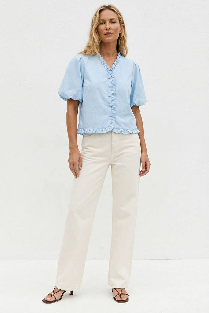 Ruffle Detail Bubble Sleeve Top: Blue