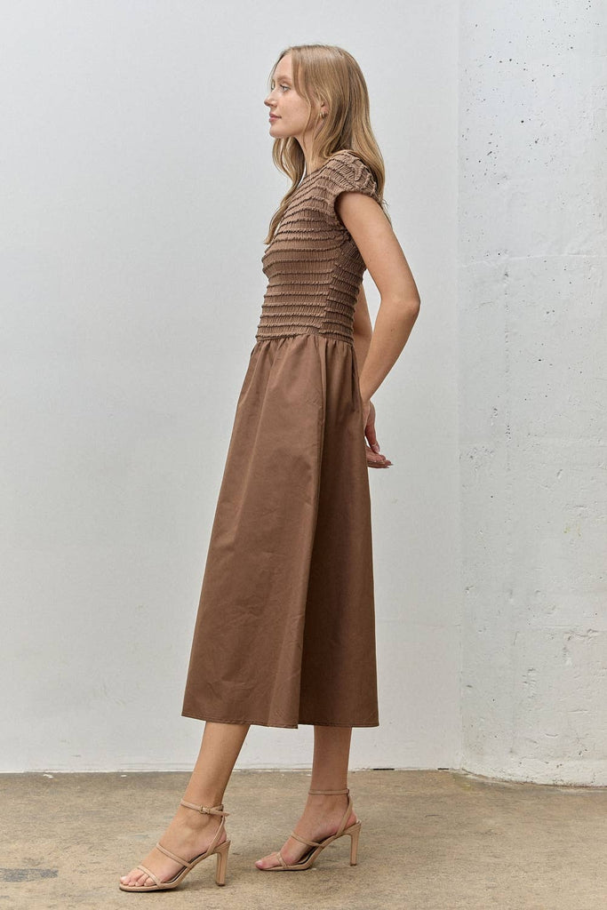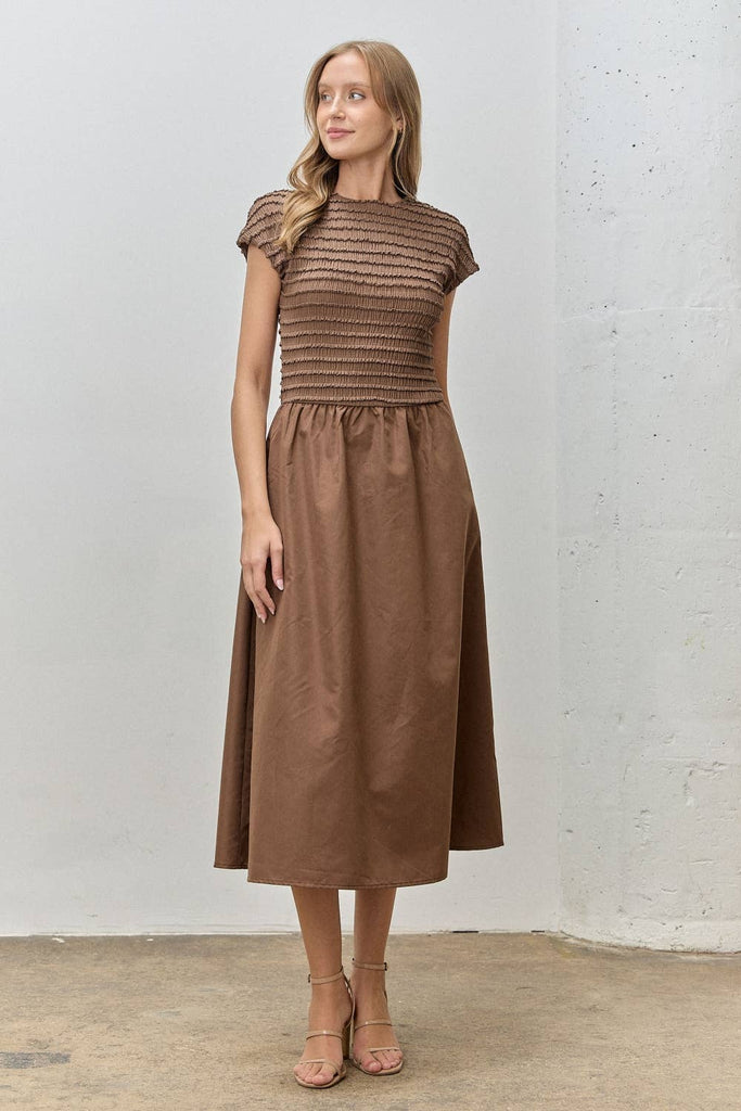 Slip into effortless elegance with this shirred top midi dress in rich brown. The halter neckline frames your shoulders beautifully while the stretchy fabric moves with you all day long. Hidden pockets keep your essentials close, because who doesn't love functional fashion? Perfect for brunch dates, casual outings, or whenever you want to look put-together without trying too hard. This versatile piece transitions seamlessly from day to night, making it a wardrobe essential that works as hard as you do.