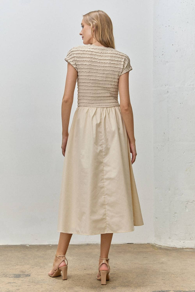 This elegant midi dress features a beautifully textured, fully shirred bodice and cap sleeves for a comfortable, custom fit. The natural hue and flowing cotton skirt create a timeless, feminine silhouette. Complete with pockets, this dress is perfect for work, showers, or elevated everyday style in any season.