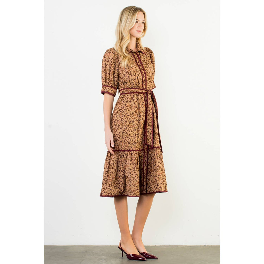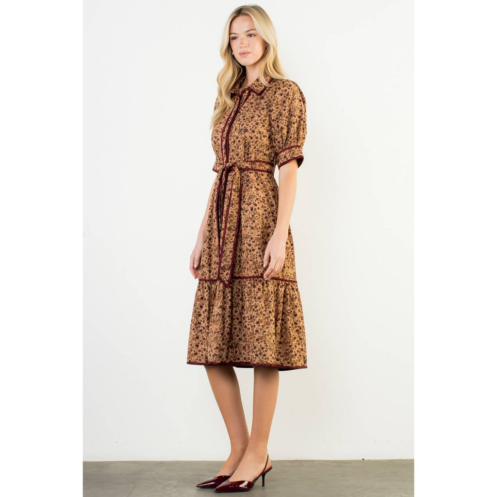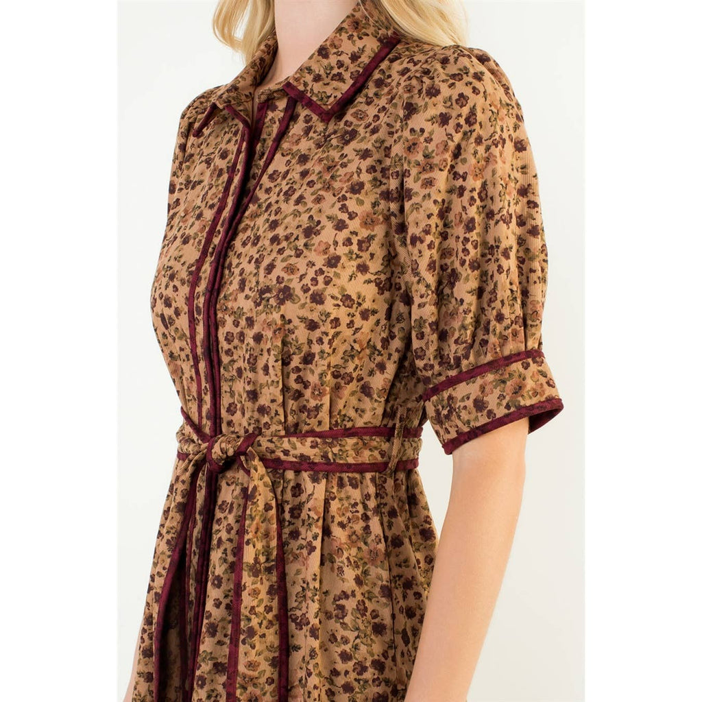 Short Sleeve Corduroy Floral Pattern Dress: BROWN