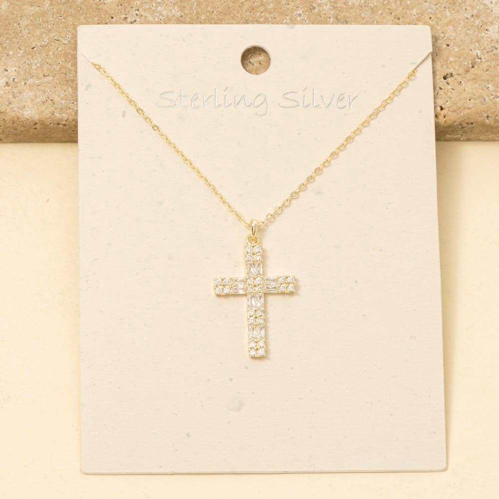 Add a touch of elegance and glamour to your look, this pendant necklace presents a striking sterling silver cubic zirconia pave cross design. Elevate your fashion game with this versatile pendant necklace, seamlessly integrating into your signature style. Available in GZ, RZ. This item is sold in packs of 1.