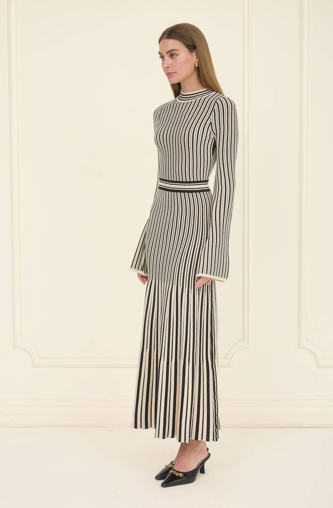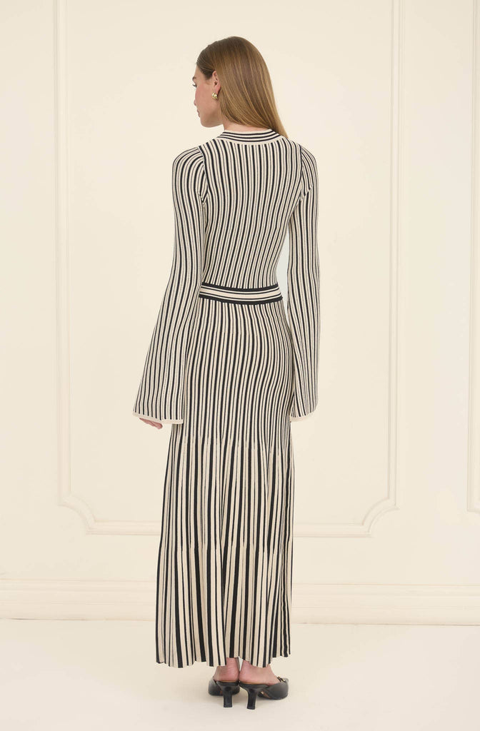 STRIPE LONG SLEEVE SWEATER PLEATED MIDI DRESS: BLACK IVORY