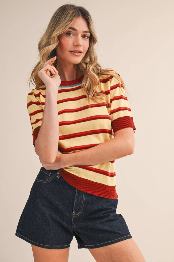 STRIPED SHORT SLEEVE SWEATER: LEMON SIENNA