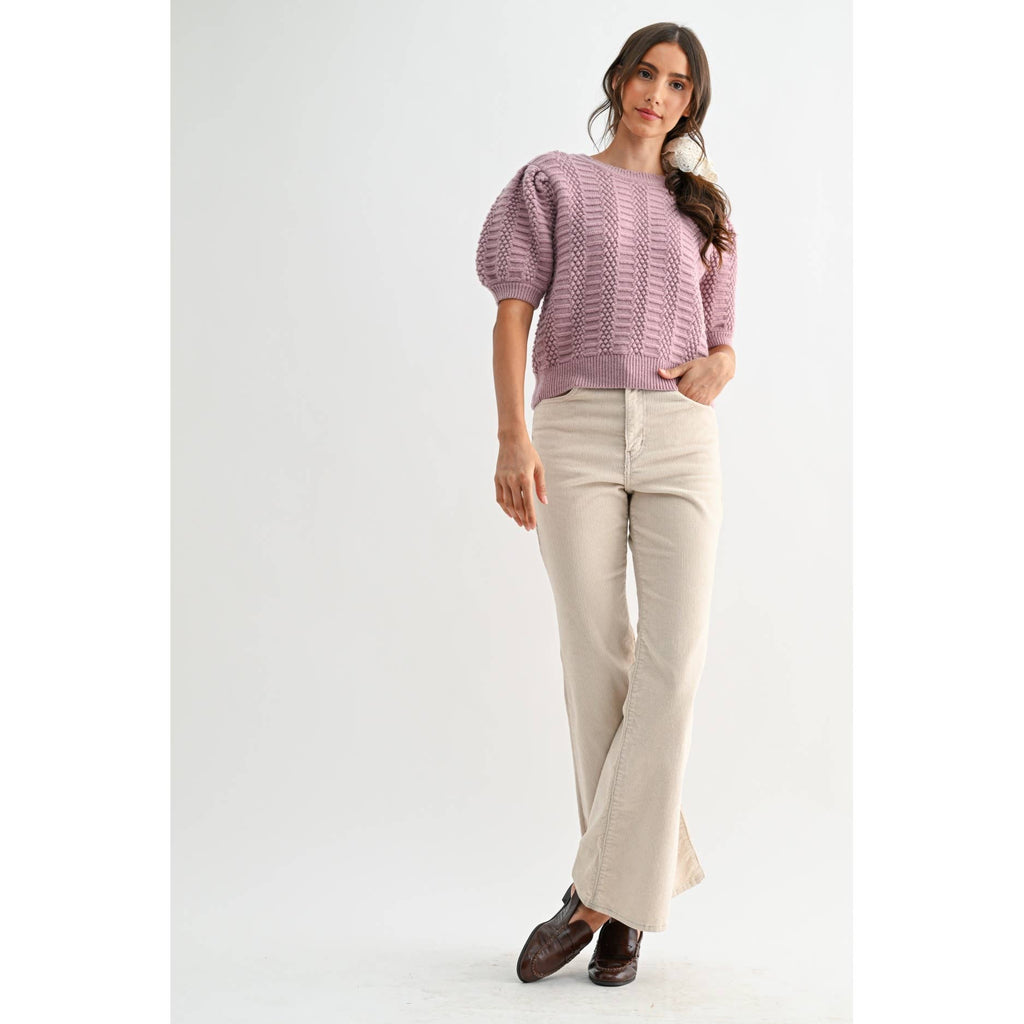 TEXTURED PUFF SLEEVE KNIT SWEATER: MAUVE