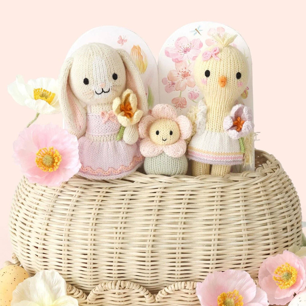 Tiny Lavender the bunny is lovingly handcrafted with a gorgeous blooming tulip tucked delicately under one arm. Dressed in a playful lavender 2-piece set with festive embroidered trim and a sweet hand-tied bow, she is so fresh for spring! We’re obsessed.