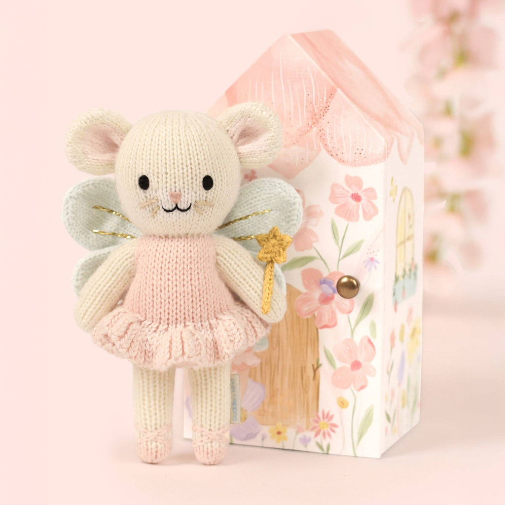 Lily the fairy is pure fairytale magic. Her iridescent hand-knit wings shimmer like a sprinkling of fairy dust, catching the light with every tiny stitch. Her fairy-sized wand features a perfectly hand-crocheted golden star that looks truly enchanted. And her tutu? Soft, ruffled, and dusted with the sweetest shimmer. Every detail is lovingly handcrafted to feel whimsical, dreamy, and oh-so-special. If you love magical touches, Lily is the one!