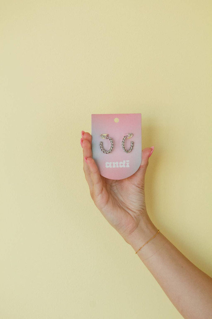 These are the absolute cutest staple earrings! They're the prettiest simple twisted style hoop that comes in both silver and gold. Because they're stainless steel, they are hypoallergenic/water resistant and perfect for any occasion!