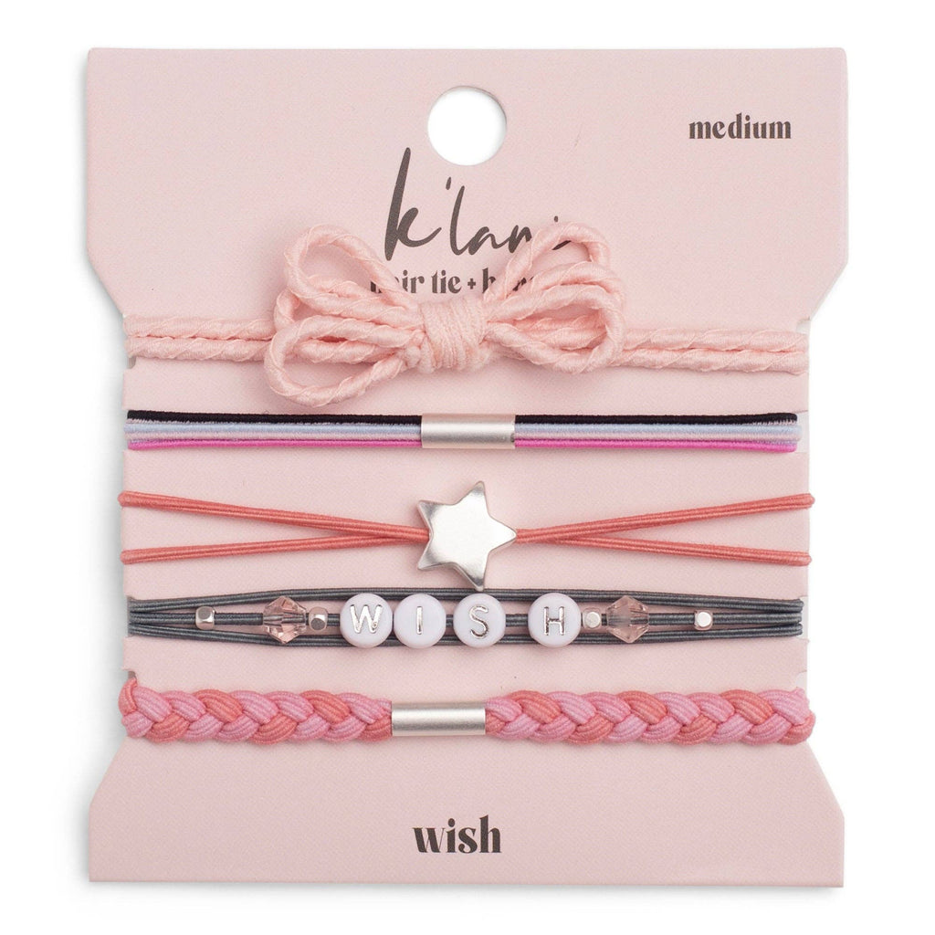 K’Lani’s Wish set brings a touch of magic and a sprinkle of joy to your everyday style. These 5 hair tie bracelets come in playful shades of pink and soft gray, featuring a silver star charm, pink crystals, and a sweet pink bow. With letter beads that spell out “wish,” this set is a dreamy reminder to believe in possibilities and keep your heart open to wonder.